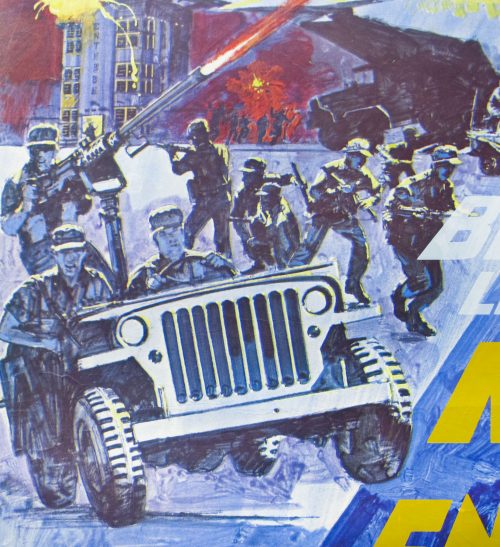 This UK quad features stylised artwork painted with large brushstrokes onto a canvas, the grain of which is clearly still visible. Sim Branaghan believes this to be the work of British artist Mike Vaughan, perhaps best known for his work on several Hammer Horror quads, including Twins of Evil.