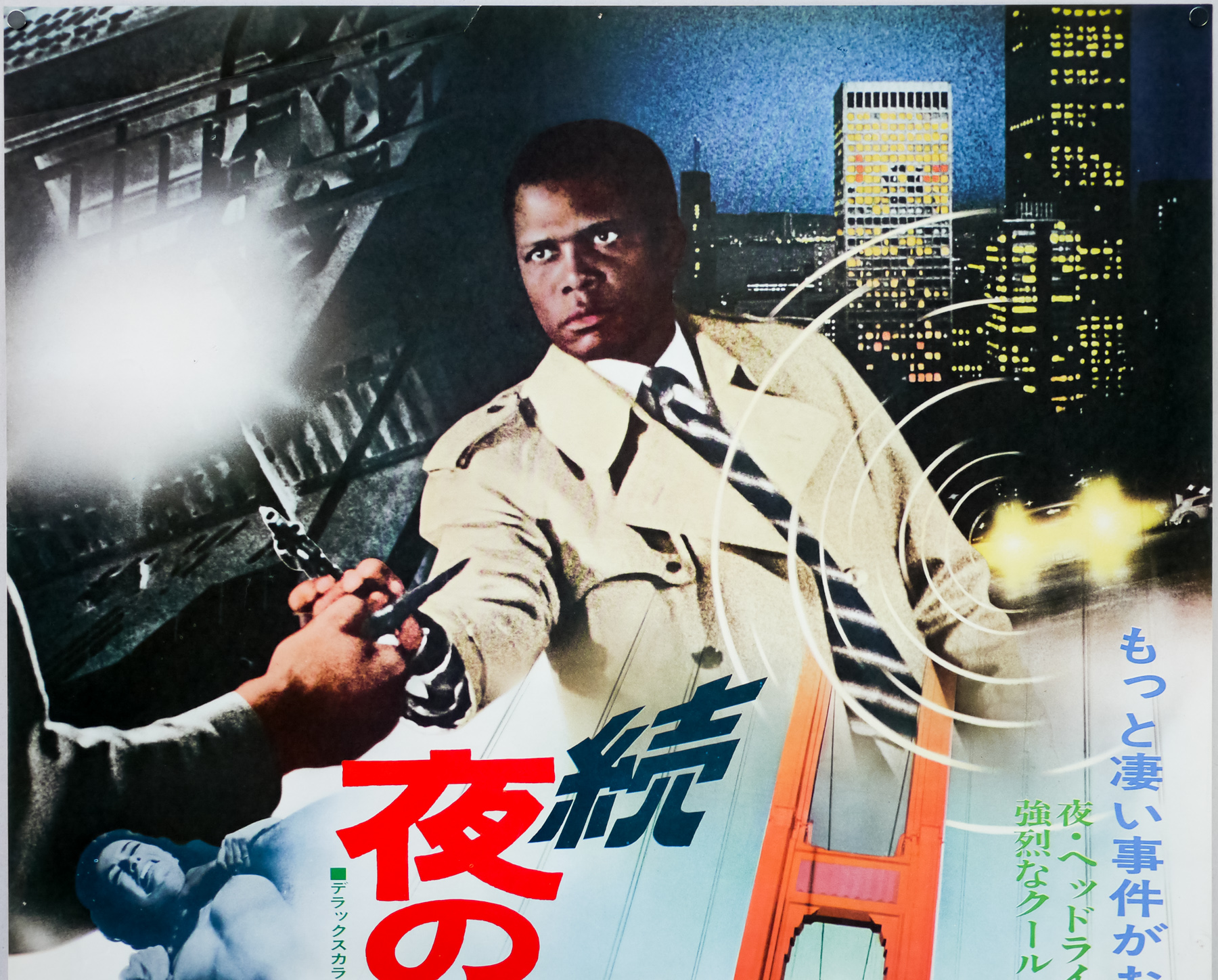 This is the Japanese B2 poster for the release of the first of two sequels to the 1967 drama In the Heat of the Night, starring Sidney Poitier as the eponymous police detective. The actor had made history in 1964 by becoming the first African American to win the Oscar for Best Actor (for Lilies of the Field), and 1967 saw him star in three hit films that all dealt with the issue of race and race relations. This included Guess Who’s Coming to Dinner, which tackled the controversial issue of interracial marriage that was still illegal in several states, and To Sir, with Love, a British drama that dealt with racial issues in an inner-city school. It was In the Heat… that was the biggest hit that year and the film would go on to win 5 Academy Awards, including Best Film and Best Actor for Rod Steiger, who played alongside Poitier.
