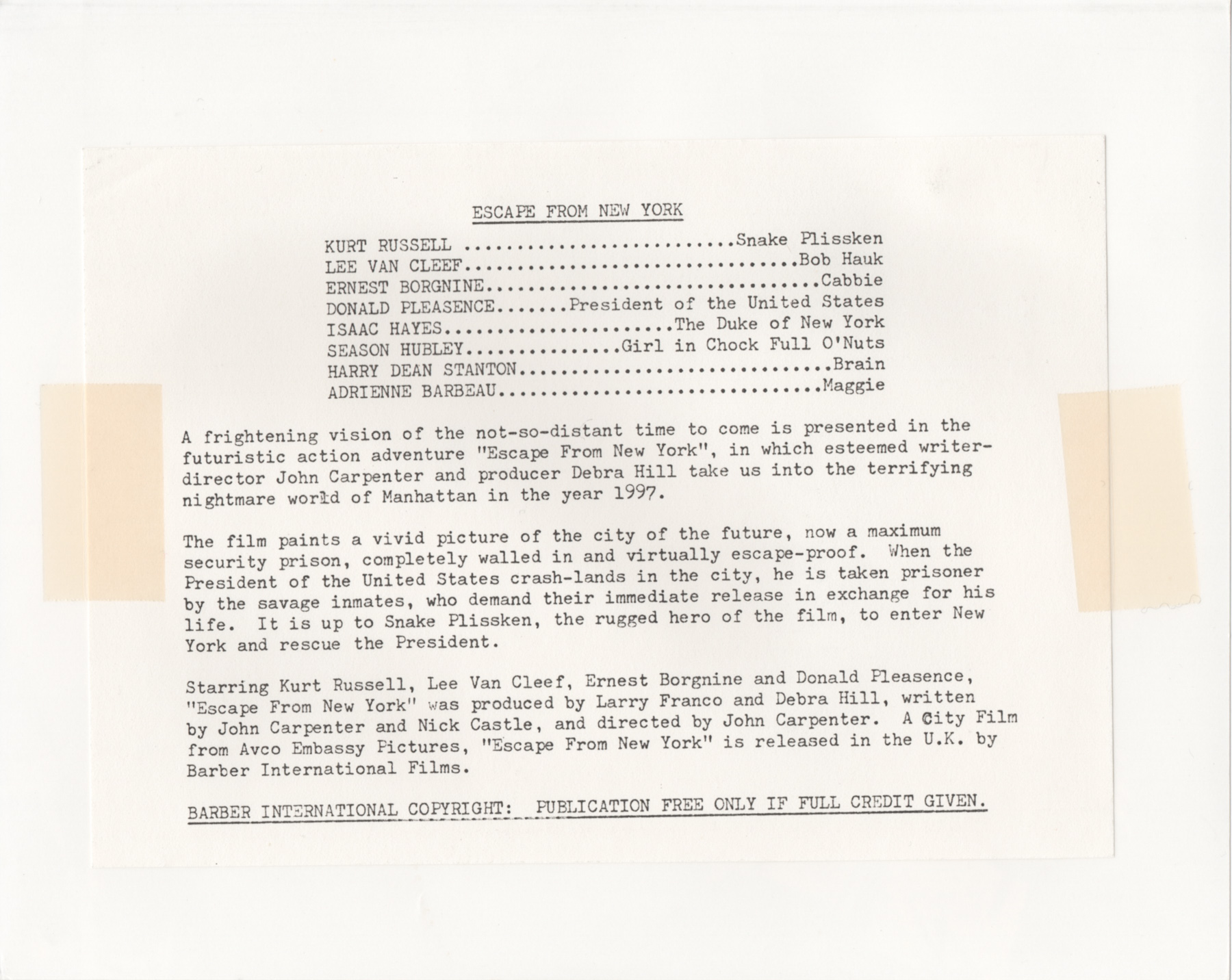 This is the original UK press kit for the release of John Carpenter’s sci-fi classic Escape From New York. I’d have a hard time choosing my favourite of the three (fictional) characters Carpenter and Kurt Russell created together; R.J. MacReady (The Thing), Jack Burton (Big Trouble in Little China) and Snake Plissken (EFNY). The latter is the gruff former war hero and convicted bank robber who is sent onto the island of Manhattan of an alternative 1997, which has been sealed-off as a lawless prison, in search of the American President whose plane crashed there after a terrorist attack. He’s arguably the coolest of the three and is a character much imitated in other lesser films featuring a reluctant hero.