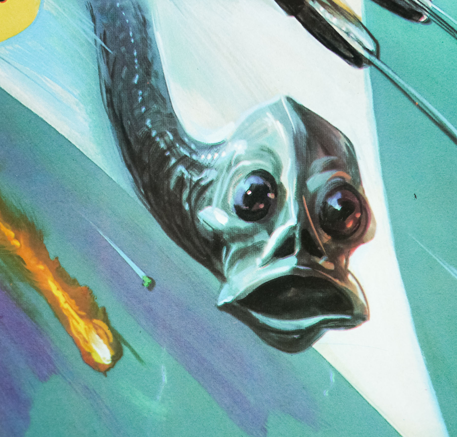 Note that the dark line seen across the centre of the poster is actually where two painted canvases have been joined together by the artist – the art was then copied ready for printing and the text and other details overlaid.
