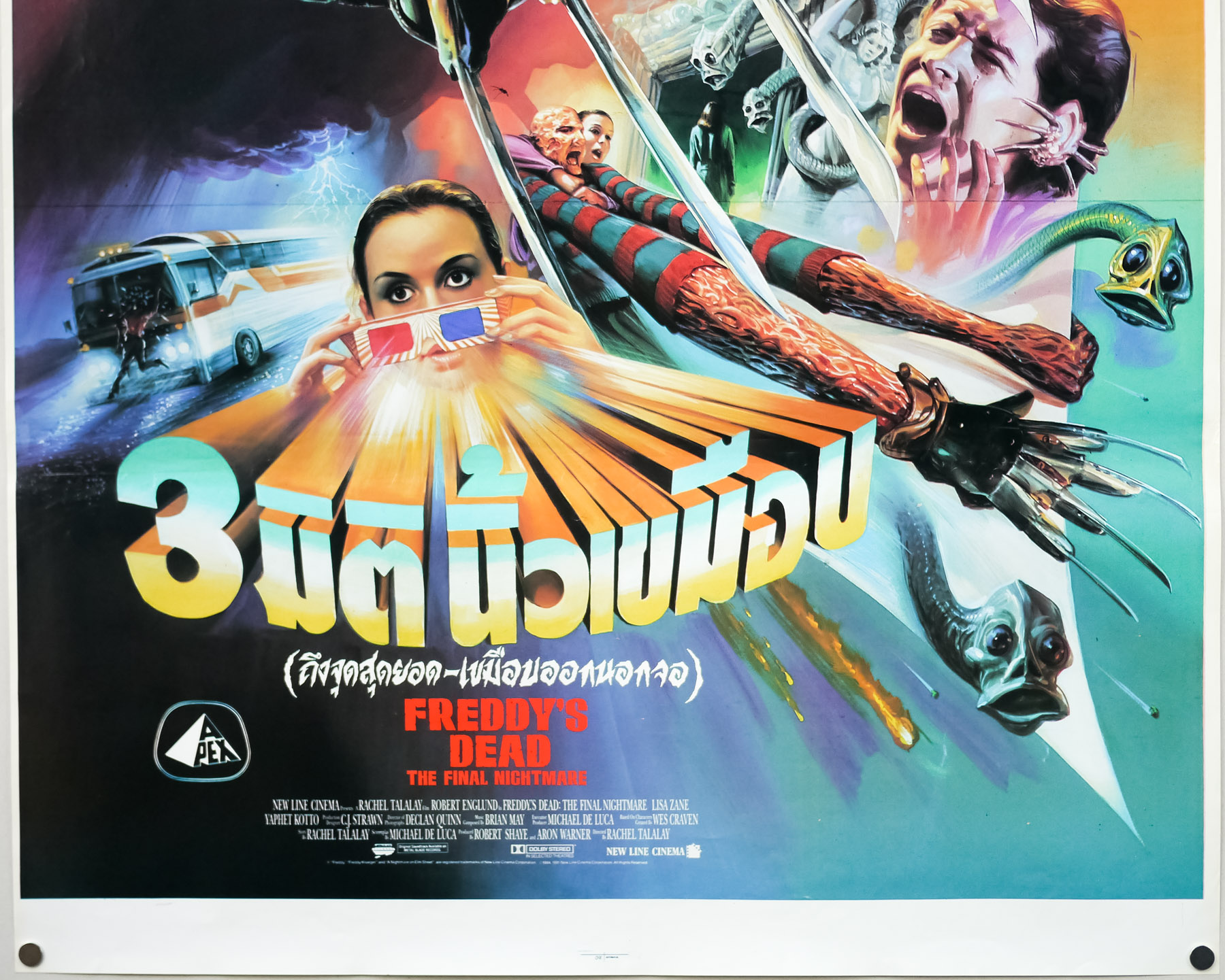 This is the original Thai poster for the release of the sixth entry in the beloved horror franchise of A Nightmare Before Elm Street. Entitled Freddy’s Dead: The Final Nightmare, it’s one of the weakest entries in the series, and that’s saying something! The finality implied by the title was nothing of the sort and a sequel was released only three years later. This was also the only film in the series to feature 3D sequences and these feature during the final 10 minutes. The 3D effects are largely terrible and had to be watched with the frustrating Anaglyph method, which uses a red filter on one eye and blue on the other. According to this fan site over 11 million pairs of glasses were distributed to cinemas at the time of release.
