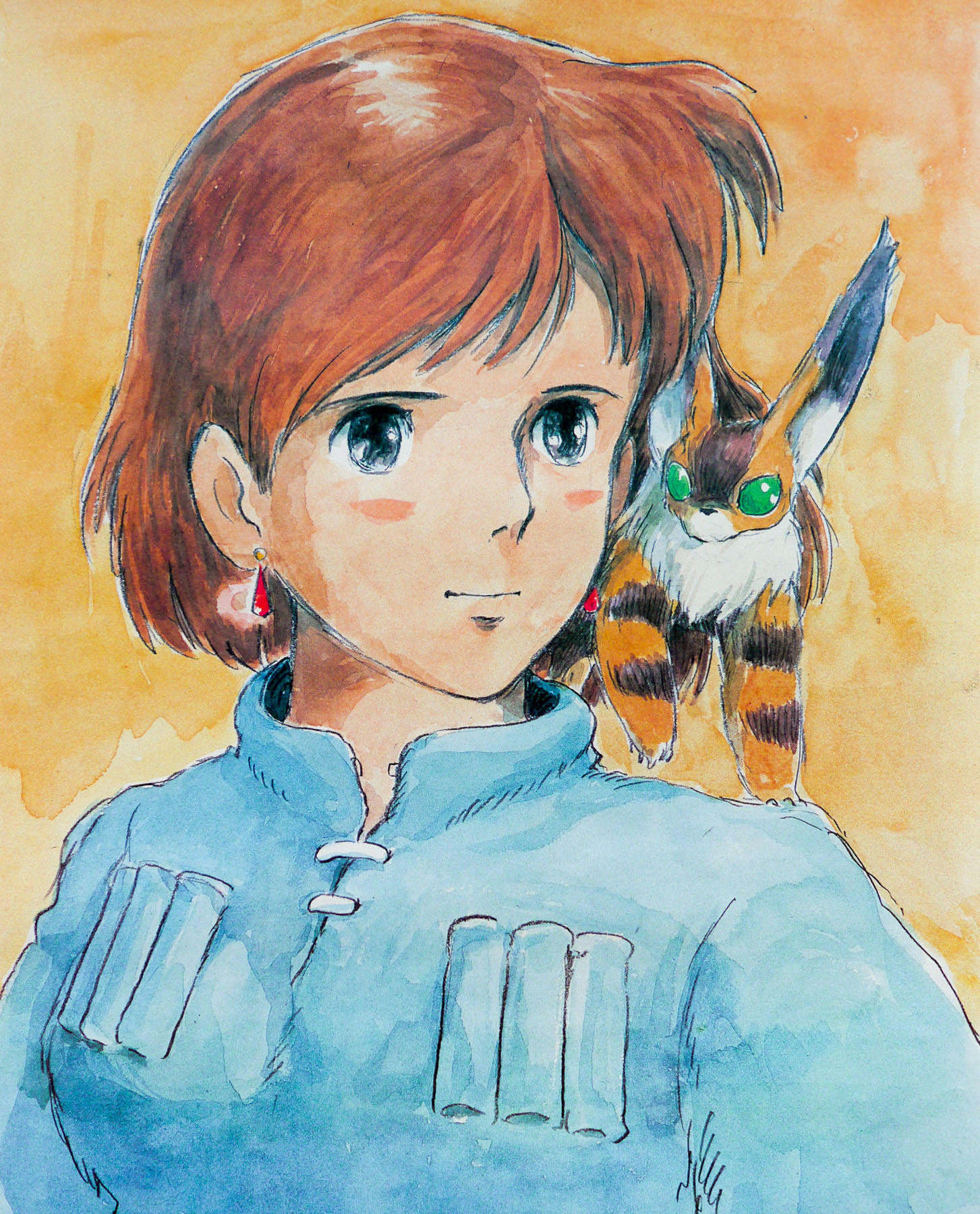 This portrait of Princess Nausicaä with her fox-squirrel companion Teto was painted by Miyazaki himself and it appears in a book of Nausicaa art titled The Nausicaa Watercolor Collection, which includes annotations by Miyazaki. In his annotation for the image, he attributes himself as the artist, while also complaining about her posture! “I know I’m the one who drew this, but I don’t really like this picture. The Nausicaa inside me would never pose like this.” Thanks to site reader Reynold for confirming this.
