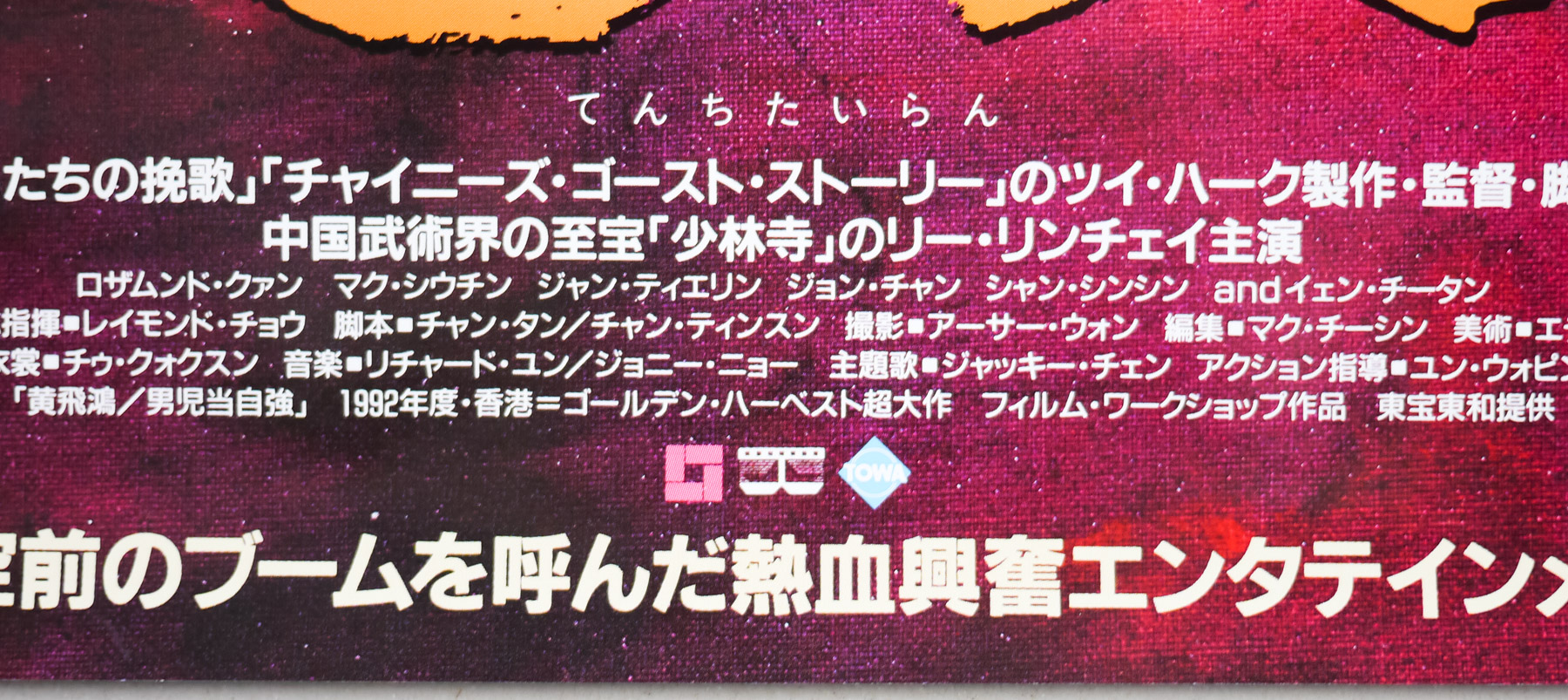 Great artwork by a Japanese artist who has signed the work ‘M. Tsuchiya’ features on this B2 for the release of the 1992 action-adventure sequel, Once Upon a Time in China II. Celebrated producer and director Tsui Hark (who also co-wrote the screenplay) would end up helming all 6 films in the OUATIC franchise that ended in 1997 with ‘Once Upon a Time in China and America’. The legendary martial artist Jet Li appeared once more as the Chinese folk hero Wong Fei-hung and Donnie Yen, another celebrated action star, plays one of the main bad guys in the film.