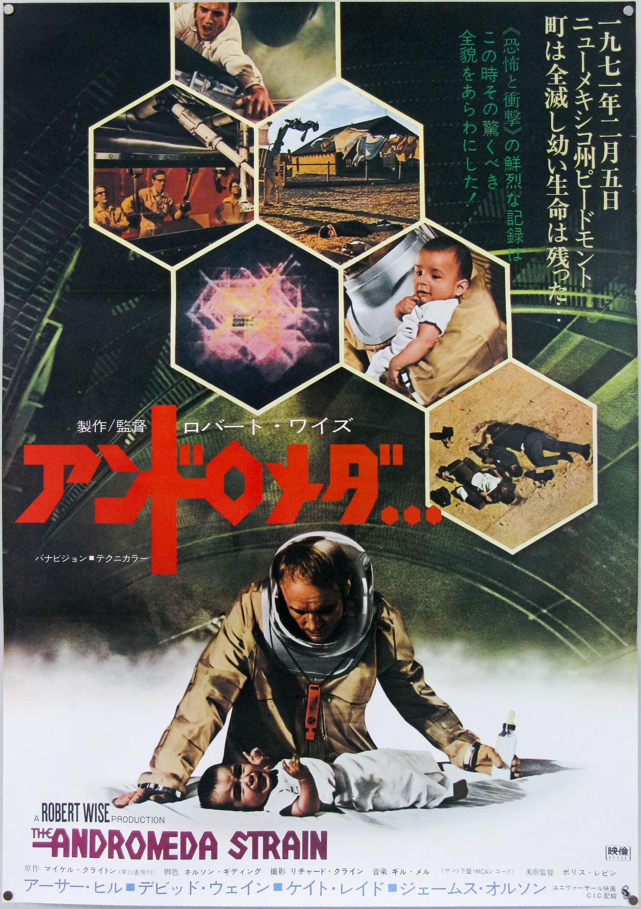 A unique design on this Japanese poster for the classic sci-fi thriller The Andromeda Strain, which was based on Michael Crichton’s book of the same name. Despite clearly being a product of the early 1970s the film still stands up today and the events depicted are no less terrifying than they were 41 years ago; the threat of an unknown and deadly disease hangs over us all.
