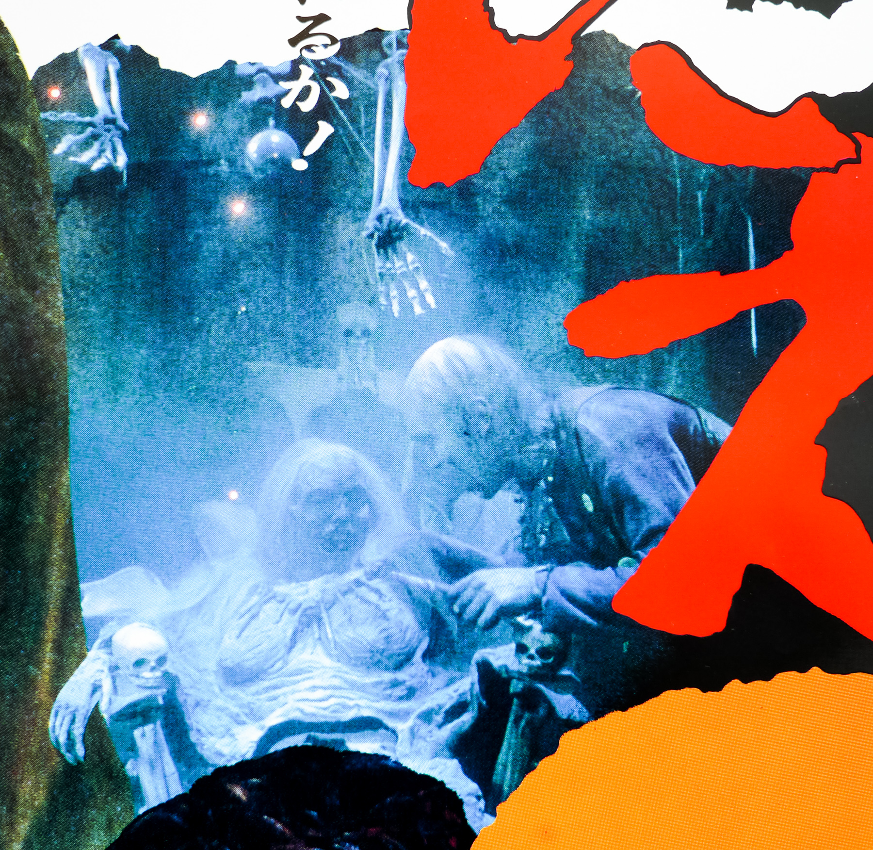 This is the Japanese B2 poster (style A) for the release of Tobe Hooper’s sequel, The Texas Chainsaw Massacre 2. Set and released 13 years after the groundbreaking original film, the story was written by Hooper and the film was this time produced by the notorious schlock-peddlers Cannon Films. The film is set in another part of Texas and sees a radio disc-jockey, Vanita ‘Stretch’ Brock (Caroline Williams), become the target of the psychotic ‘family’ seen in the first film. At the start of the film a pair of jocks are killed by Leatherface (Bill Johnson) after they play chicken with the car that he and Chop-Top (Bill Moseley) are in.