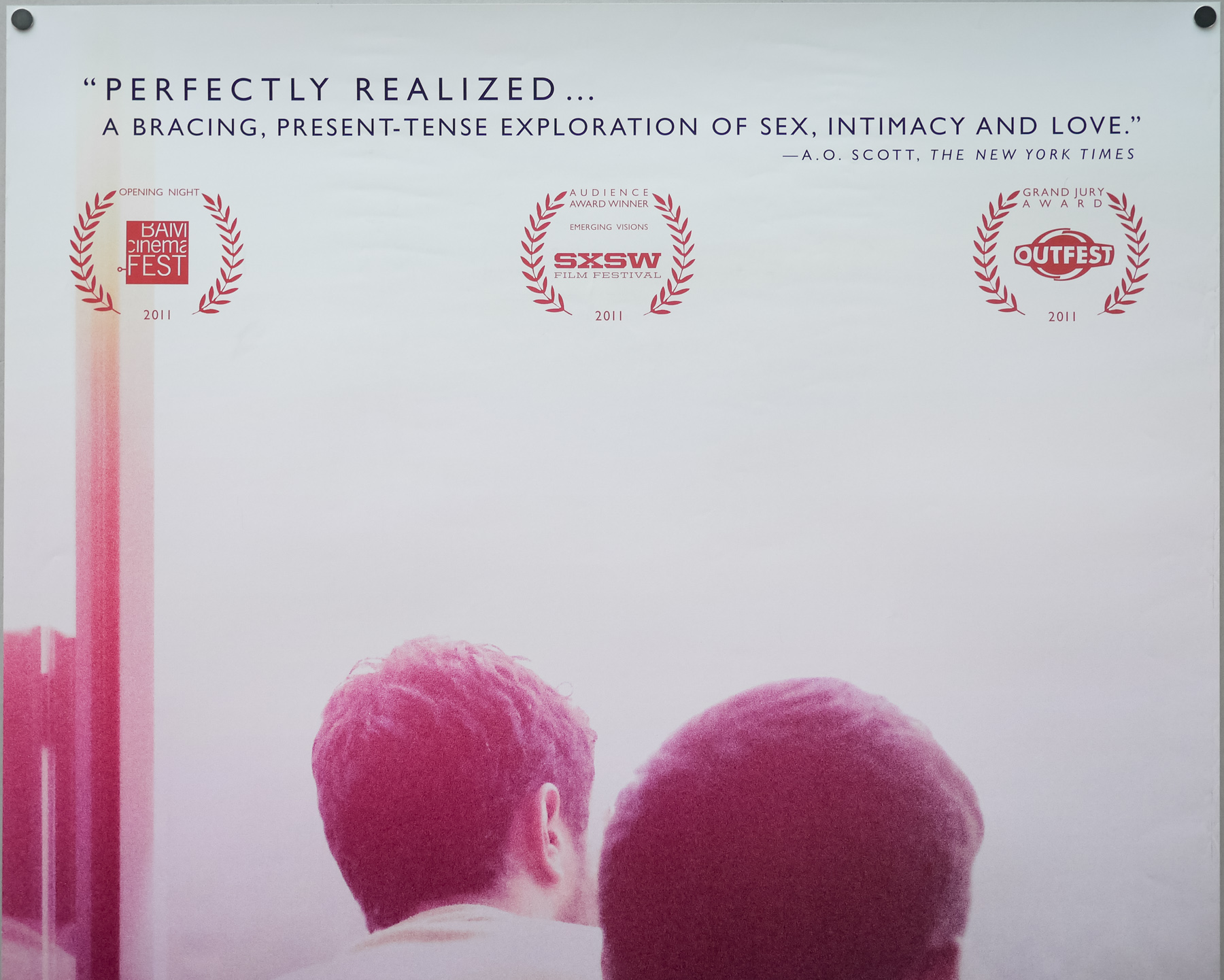 This is the US one sheet for the release of the 2011 British drama Weekend, written and directed by Andrew Haigh. The film was shot on location in and around Nottingham on a micro budget. It follows gay man Russell (Tom Cullen) who goes to a house party with his straight friends and then onto a gay club alone afterwards looking for a hookup. There he meets Glen (Chris New), an art gallery employee and aspiring artist, and the pair head back to Russell’s flat for what they both assume will just be a one night stand.